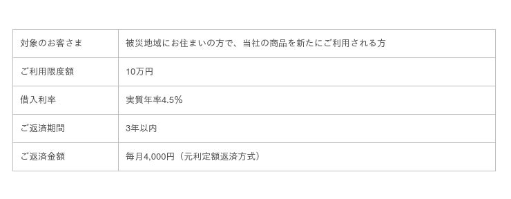 本商品のご利用にあたっては、所定の審査があります。ご利用が可能となる対象地域、取扱期間の詳細およびフリーダイヤルなどのお問い合わせ先につきましては、災害発生時に都度、新生フィナンシャルのウェブサイトなどでご案内します。