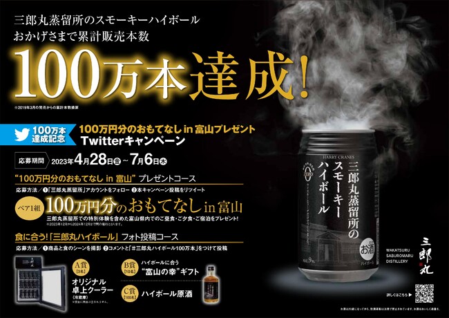 三郎丸蒸留所のスモーキーハイボール累計販売本数100万本達成!『100万円分のおもてなし in 富山 プレゼント Twitterキャンペーン』