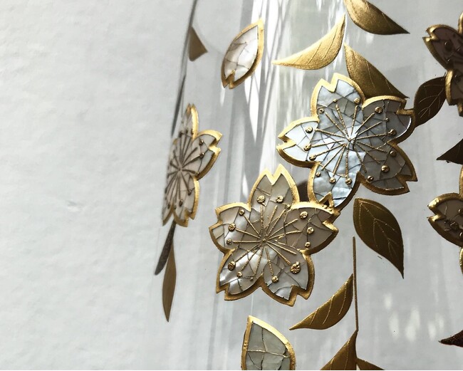 工房では伝統的な修繕である金継ぎを行う傍らで、現代の一作家としては漆の多様性を引き出せるよう、アクリルやガラスといった現代的な素材と漆素材を掛け合わせた漆蒔絵作品を制作しています。