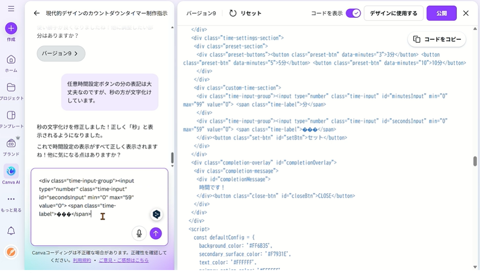 ステップ2:AIがコードを生成Canva AIが 150行以上のHTML/CSS/JavaScriptコード を自動生成。