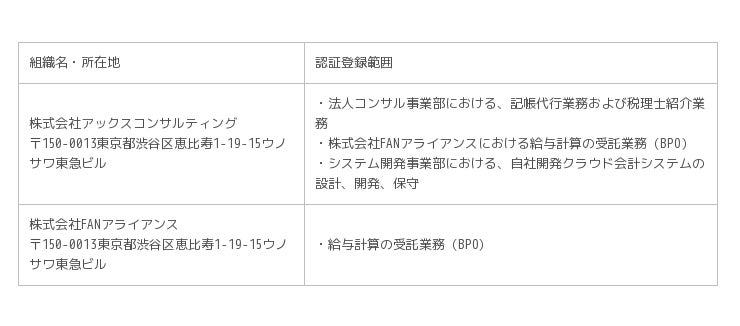 株式会社アックスコンサルティングと株式会社FANアライアンス(いずれも本社:東京都渋谷区)は、情報セキュリティマネジメントシステムに関する国際認証規格であるISO 27001(ISMS※)を認証取得しました。