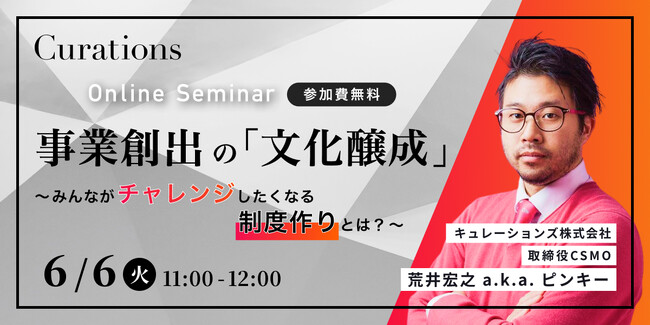 顧客企業のビジネス変革を成功に導くキュレーションズ株式会社(本社:東京都渋谷区、代表取締役社長:根本隆之、以下当社)は、『事業創出の「文化醸成」〜みんながチャレンジしたくなる制度作りとは?〜』を2023月6月6日(火)に開催いたします。