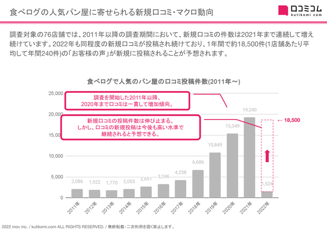 2022年は、1年間で約18,500件、1店舗当たり平均年間240件の口コミが寄せられると予想されます。
