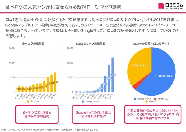 口コミを投稿先サイト別に分解すると2016年までは食べログが口コミの中心であったのに対し、2021年には全体の約6割がGoogleマップへの口コミ投稿に置き換わっています。今後はより一層Googleマップが口コミの投稿先として活用されていくものと思われます。