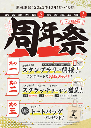 期間中に「山下本気うどん 渋谷並木橋」と「山下本気うどん 渋谷道玄坂」にそれぞれにご来店いただくと、3回目の来店で、20%引きになる「2店舗制覇で20%引きスタンプラリー」※1の配布や、削って楽しい最大20%引きのクーポンがもらえる「周年祭限定スクラッチクーポン」※2を実施いたします。また、「山下本気うどんロゴ入りトートバッグ」※3をプレゼントいたします。