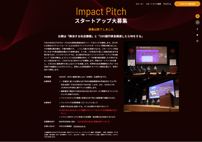 フィンテックサミット2022は、金融庁と日本経済新聞社が共催する日本最大級のフィンテックカンファレンスです。本カンファレンスでは、主に国内の有力なフィンテックスタートアップを対象として「自社が解決しようとしている社会課題は何か」と「200億円資金調達したら何をするか」に焦点をあてた、これまでにない形のピッチ:「インパクトピッチ」を開催。世界的な社会課題解決とグローバル市場での展開をにらんだピッチとし、英語による同時通訳とオンライン配信を通じて世界に向けて発信します。