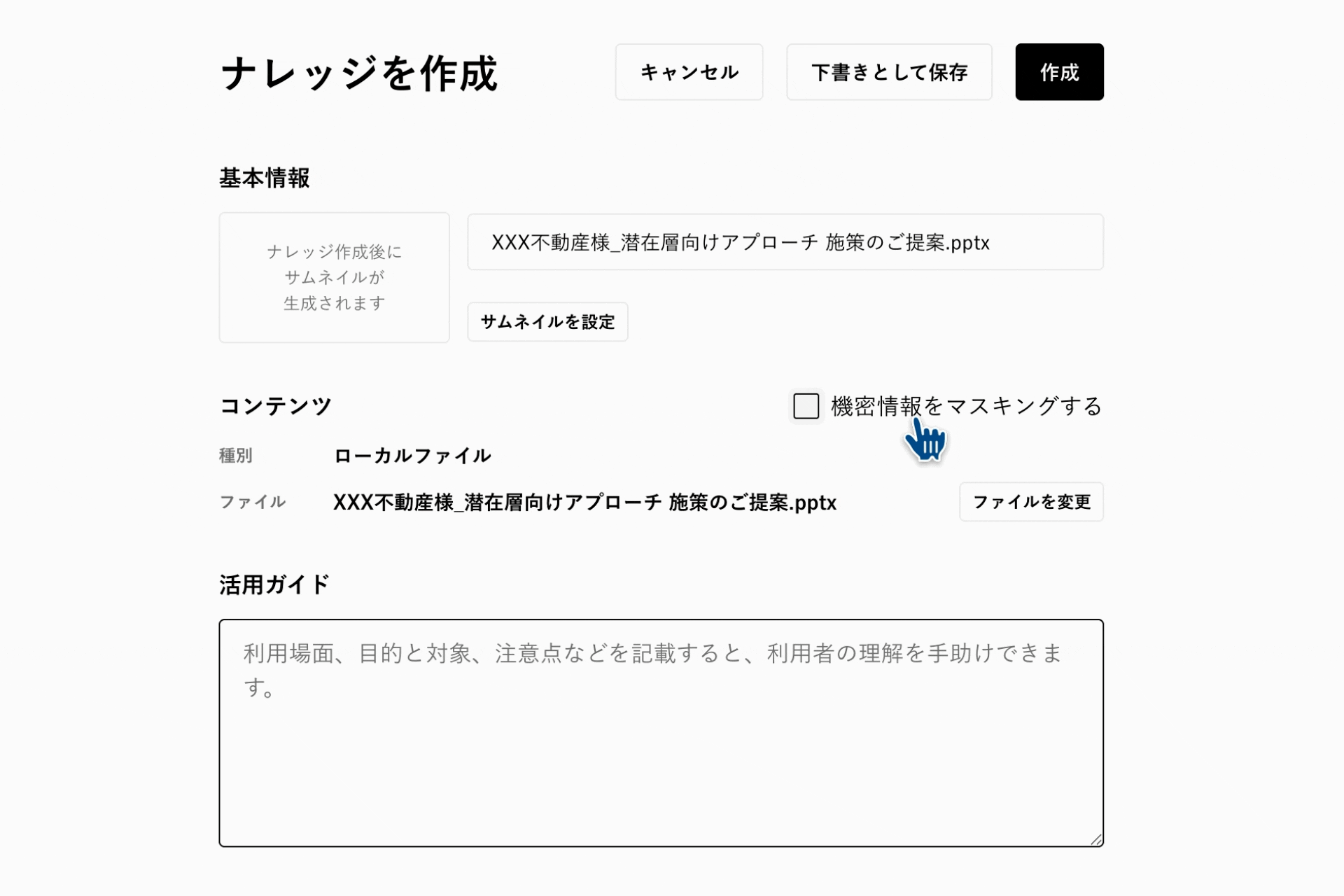 ナレッジ共有の際に「自動マスキング」を選択するだけで、対象ファイル内の機密情報が自動で処理された下書きが作成されます。