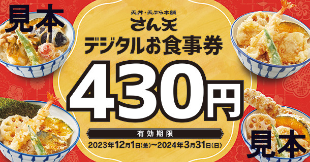 サトフードサービス株式会社(本社・大阪府大阪市、代表取締役社長・杉本 貴之)が運営する「天丼・天ぷら本舗 さん天 」では、2023年12月1日(金)〜12月14日(木)まで、「デジタルお食事券430円分」がその場で50名様に当たる、お得なXキャンペーンを開催します。天丼・天ぷら本舗さん天のX公式アカウントをフォローし、キャンペーンポストをリポストすることで抽選いただけます。会計から430円引きになる本お食事券は看板商品の得(まるとく)天丼=430円をはじめ、「天丼・天ぷら本舗 さん天 」の各店舗で様々な商品にご利用いただけます。