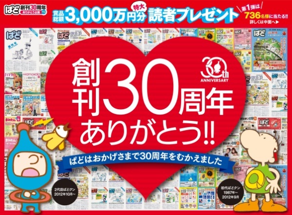 地域情報誌『ぱど』創刊30周年を記念して、1年間にわたって各種企画を実施。企画第一弾として、商品総額3,000万円以上の読者向けプレゼント企画を実施。