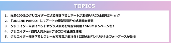 豊島区が目指す『国際アート・カルチャー都市』に賛同し、クリエイティブスタジオ「R11R」と池袋PARCOがコラボレーションして開催する全館アート企画です。2023年10月13日(金)から11月12日(日)の期間、前年の183名から増加した200名のクリエイターが”Emotion”をテーマに描き下ろした新作アートを池袋PARCO全館で展示します。期間中、ライブペイントやサイン会などの参加クリエイターによるイベントを実施。さらに、NFT PHOTO BOOTHの設置、そしてONLINE PARCOでは複製原画や公式図録の販売など、リアルとオンラインの双方で気軽にアートを楽しむことができる様々なイベントを展開します。