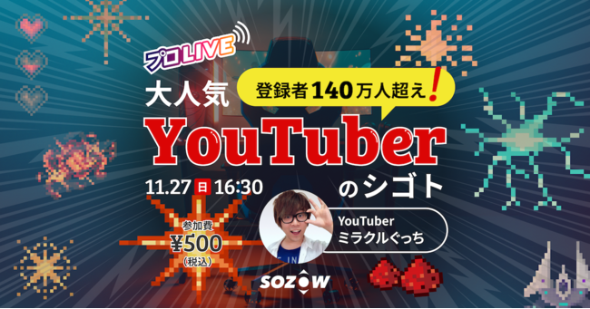 Go Visions株式会社(所在地:東京都品川区、代表取締役:小助川 将)が運営する小・中学生向けオンラインの学び場「SOZOW(ソーゾウ)」は、11月27日(日)に、YouTuberのミラクルぐっちさんをゲストにお迎えし、「YouTuberのシゴト」について子どもたちが話を聞ける特別イベントを開催いたします。