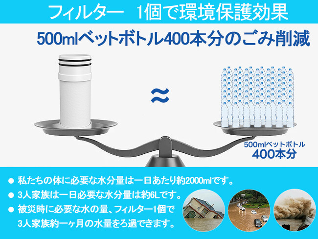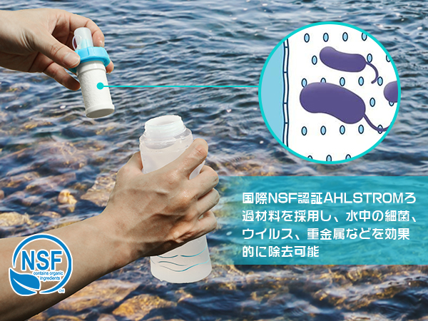 この携帯浄水ボトルは、災害や断水などの緊急時、地震、津波、台風などの自然災害が発生した時、川やため池の水を安心して飲めるほど透き通った清潔な飲料水にろ過することができます。大切な家族の為の災害時の備え! 緊急用に一つ常備しておくことをおすすめします。※海水はろ過されません。