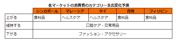 シンガポール、台湾、フィリピンでは、消費者は食料品への支出を増やすと予想し、マレーシアとタイでは、消費者はヘルスケアカテゴリーの商品への支出を増やすと予想しています。