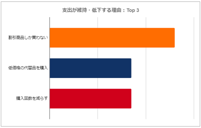 今後6ヶ月間に支出を維持する、または減らすと予想する消費者の主な理由は、割引商品、または低価格の代替商品のみしか購入しないことと、購入頻度を減らすこととなりました。回答者の多くが、長期的にコストを削減するため、商品のまとめ買いを行う傾向があります。