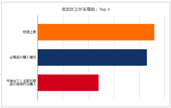 今後6ヶ月間に支出が増えると予想する主な理由は、物価の上昇、必需品の購入増加と、これから盛り上がりを見せる割引セール商品の自発的な買い物となりました。