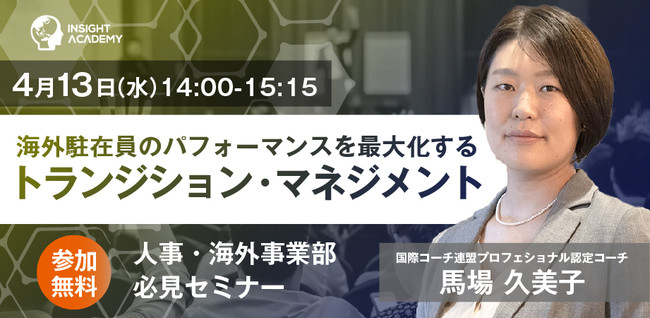グローバル人材育成・研修業を手掛けるインサイトアカデミー株式会社(本社:東京都港区六本木、代表取締役:北村 嘉章)は、【海外駐在員のパフォーマンスを最大化する】トランジション・マネジメント《無料アーカイブ動画生配信》を、2022年4月13日(水)14時より開催致します。