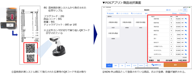 NONPLUバーコード読取に、単価エリアを商品数量として読み取りできるようになりました。本機能により、回転寿司などで利用されているハンディ型の皿枚数計測システム(OAISOやTopperなど)から出力される商品一覧のQRコードから、商品数量を正しく読み取り明細登録することができます。