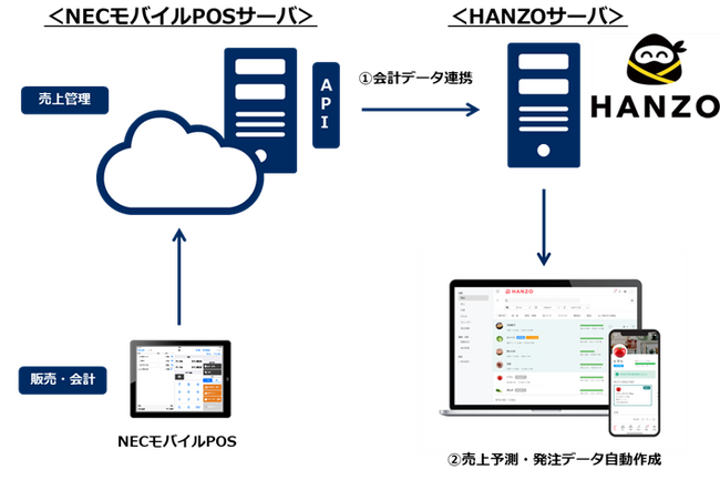 NECモバイルPOSクラウドサーバからGoals社のHANZOサーバへ売上データが取り込めるようになりました。取り込まれた売上データから、売上の予測や食材の発注量の計算、売上に対する最適な必要人員数の算出などをAIが自動で行い、バックヤード業務の負担を軽減します。