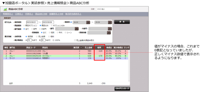 ABC分析の画面でマイナス数値の表記に対応しました。