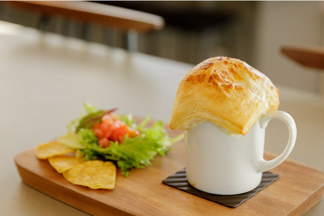 上映会場の隣には室内でゆったりとくつろぎながら景色を見渡せるカフェがあり、ソファースペースをはじめ、テーブル席やカウンター席などの座席があります。カフェ店内では、長野県産の牛肉を使用した「ビーフシチュー」や竜王名物ネマガリダケを使用した「雲海パイ包みスープ」など、地元名産の食材を使用したオリジナルメニューを楽しむことができ、映画上映前のディナーにオススメです。