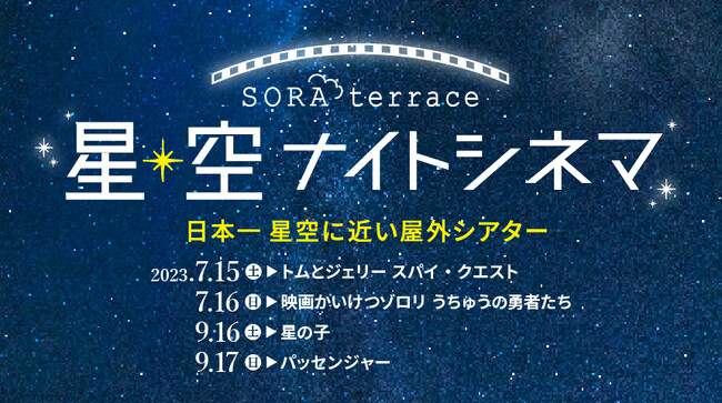 株式会社北志賀竜王(所在地:長野県下高井郡、代表取締役社長:西口昌司)が運営する「竜王マウンテンリゾートSORA terrace」は、2023年7月15日(土)、16日(日)、2023年9月16日(土)、17日(日)に屋外シアターイベント「星空ナイトシネマ」を開催いたします。「夜・星・宇宙」に関連のあるアニメや邦画、洋画など、全4作品を無料(※1)で上映いたします。