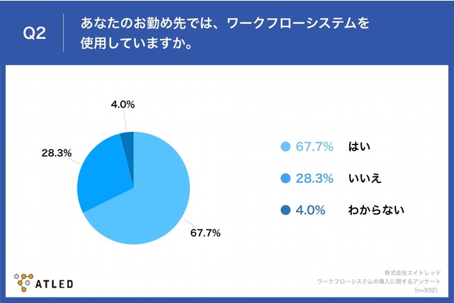 「Q2.あなたのお勤め先では、ワークフローシステムを使用していますか。」と質問したところ、「はい」が67.7%、「いいえ」が28.3%という回答となりました。