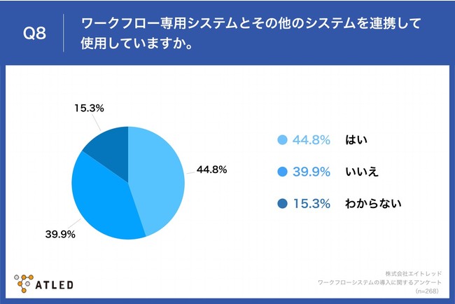 「Q8.ワークフロー専用システムとその他のシステムを連携して使用していますか。」と質問したところ、「はい」が44.8%、「いいえ」が39.9%という回答となりました。