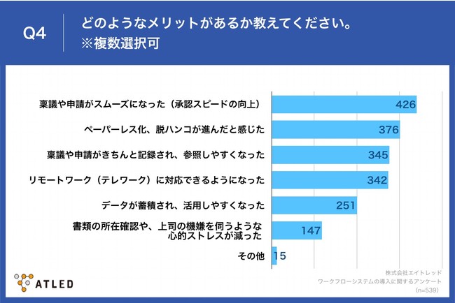「Q4.どのようなメリットがあるか教えてください。※複数選択可」と質問したところ、「稟議や申請がスムーズになった(承認スピードの向上)」が426票、「ペーパーレス化、脱ハンコが進んだと感じた」が376票という回答となりました。