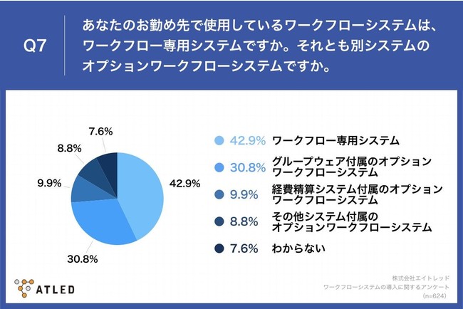 「Q7.あなたのお勤め先で使用しているワークフローシステムは、ワークフロー専用システムですか。それとも別システムのオプションワークフローシステムですか。」と質問したところ、「ワークフロー専用システム」が42.9%、「グループウェア付属のオプションワークフローシステム」が30.8%という回答となりました。
