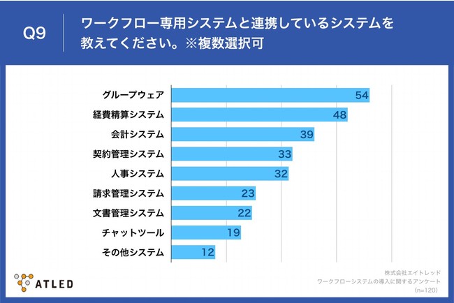 「Q9.ワークフロー専用システムと連携しているシステムを教えてください。※複数選択可」と質問したところ、「グループウェア」が54票、「経費精算システム」が48票という回答となりました。