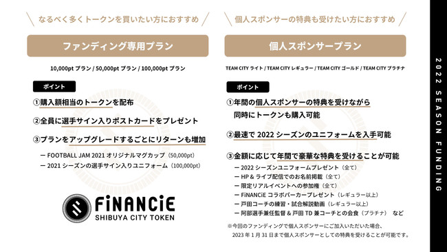 トークン発行による売上は2022シーズンのSHIBUYA CITY FCのクラブの強化・運営・社会貢献活動等の実施費用へ活用いたします。