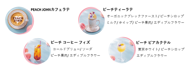 この夏限定の#クロッフルと合わせたピーチフレーバーの、見た目にも可愛いドリンク3種とPEACH JOHNのロゴが入ったカフェラテもご提供いたします。ぜひ、ピーチメルバクロッフルとセットでどうぞ。