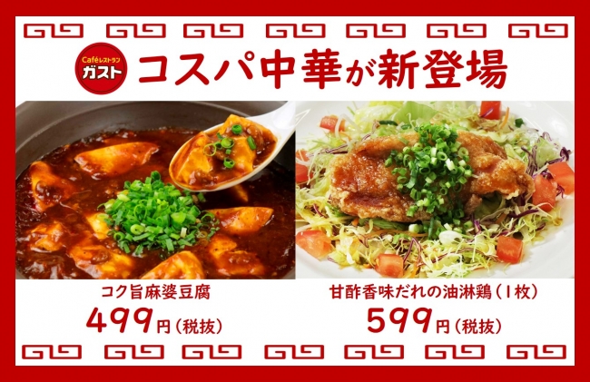 “手頃な価格で、野菜もお肉もバランスよく食べたい”という声にお応えして、おぼろ豆腐※を使用した「コク旨麻婆豆腐」、たっぷりのサラダと香味だれでカリッと揚げたチキンをさっぱり味わえる「甘酢香味だれの油淋鶏」、豚肉と野菜を、テンメンジャンベースのオリジナル味噌ダレで炒めた「お野菜たっぷり豚肉味噌炒め」など、お持ちかえり可能な中華の定番メニューが499〜599円(税抜)という低価格でガストのメニューに仲間入りします。