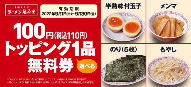ラーメン魁力屋にご来店いただいたお客様に、「選べるトッピング1品無料券」の配布を開始いたします。