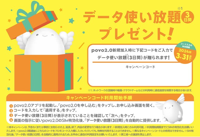 「povo2.0」新規加入時にキャンペーンコード入力で「データ使い放題(3日間)」贈呈のお知らせ