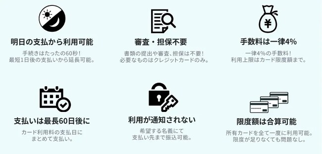 個人事業主・法人企業を対象とした「支払い.com」は、企業間の取引におけるあらゆる銀行振込のお支払いを、ユーザーがお持ちのクレジットカードで決済できるサービスです。お支払いをクレジットカードのお引落日まで延長することで、ユーザーは資金繰りの改善が可能となります。また、ユーザーは書類の提出や面談、審査は必要ありません。