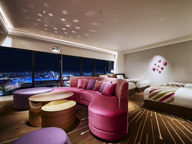 客室はパークを一望できる「スパークルーム」、上階がリビングエリア、下階がベッドルームとなった、自宅のように寛げる「もこもこメゾネットルーム」、2 段ベッドを 3 台設置した最大 6 名で宿泊できる「レインボールーム」など、個性あふれる 14 種類のゲストルームを備えています。エントランスやロビーには、ユニバーサル・スタジオ・ジャパン「ミニオン・パーク」のミニオンたちとコラボレーションした装飾(期間:2023年7月14日(金)まで予定)を施し、訪れるお客さまを楽しくお出迎えしています。