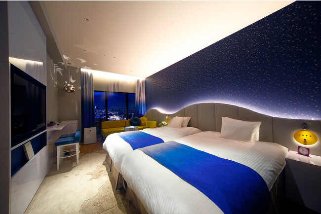 夜空に輝く星々をモチーフにデザインされた「スターリールーム」に1人5,000円で宿泊できるプランです。対象日の同ルーム宿泊料金に対し約50%OFFのサプライズプライスです。壁にたくさんの小さな星が描かれた室内には、月と星が浮かび上がるペンダントライトがきらめいています。まるで夜空に浮かんでいるかのような感覚で過ごせるロマンチックな空間を演出しています。
