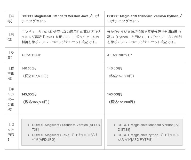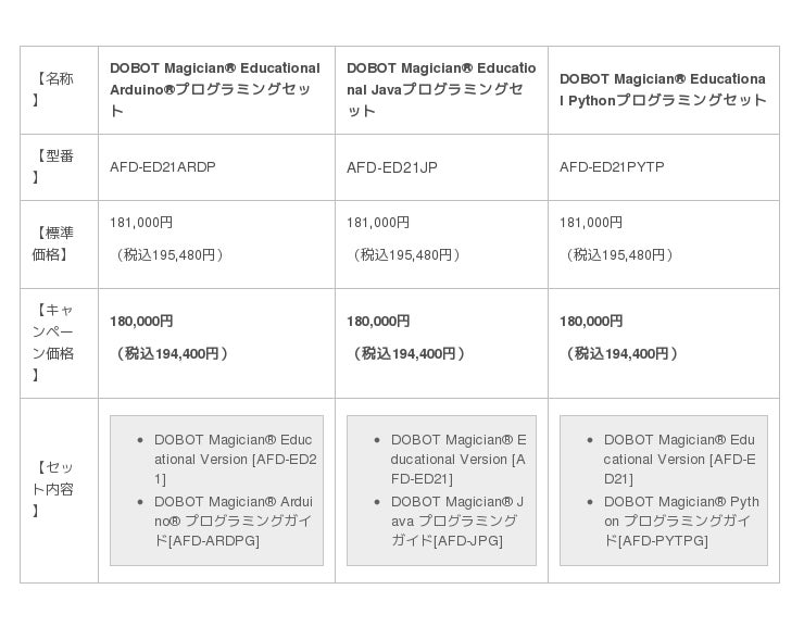株式会社アフレル(福井県福井市、代表取締役社長 小林靖英)は、コンパクトで高精度なロボットアームDOBOT Magician(R)※1の基本制御が学べる「Java」、「Python」と、世界中で人気のマイコンボード「Arduino(R)※2」でのプログラミングを通して外部制御が学べる「Arduino(R)」のプログラミングガイドを新発売いたしました。発売を記念して限定価格でセットを購入できる「新発売キャンペーンvol.3」を2018年11月30日(金)まで実施いたします。(https://afrel.co.jp/product/dobot#dobotProduct01)