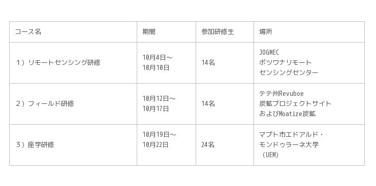 今回の研修では、同国石炭開発事業に本格的に取り組む地質技師および技術者に対して石炭開発に必要なリモートセンシング技術、探査技術、炭量評価をはじめとする経済性評価、世界の石炭需給動向に関する知識取得を目的とし、研修の拠点をボツワナリモートセンシングセンター、テテ州Revuboe炭鉱プロジェクトサイトおよびMoatize炭鉱ならびにエドアルド・モンドゥラーネ大学(マプト市)に移し、3コースの研修を実施致しました。