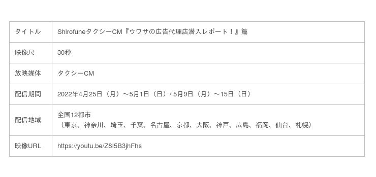 広告運用自動化ツール「Shirofune」は、2022年4月25日(月)〜5月1日(日)と5月9日(月)〜15日(日)の14日間で、東京を含む全国12都市で、女優の速瀬愛さん出演の初タクシーCM『ウワサの広告代理店潜入レポート!』篇の配信を開始いたします。