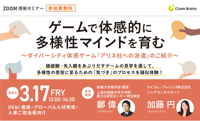 【ゲームで体感的に多様性マインドを育む〜ダイバーシティ体感ゲーム『アリス社への派遣』のご紹介〜】サイコム・ブレインズ、シニアコンサルタント加藤円によるオンラインセミナーを3月17日(金)に開催
