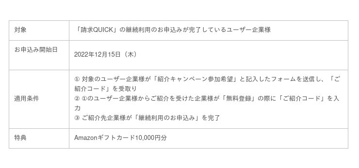 「請求QUICK」を継続利用されているユーザー企業様に、お取引先やご関係の企業様へ「請求QUICK」をご紹介いただき、ご紹介を受けた企業様が「継続利用のお申込み」を完了いただくと、ご紹介元のユーザー企業様にAmazonギフトカード10,000円分を特典としてプレゼントするキャンペーンです。