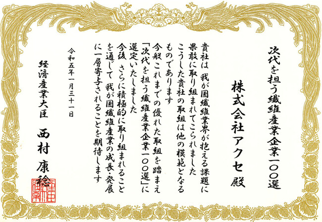 経済産業省が認定する「次代を担う繊維産業企業100選」に株式会社アクセが選定されました。