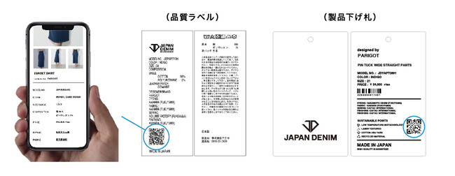 JAPAN DENIM(ジャパンデニム)の各製品には産地事業者を明示したラベル下げ札を取り付け、QRコードも印字。