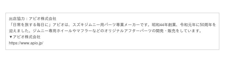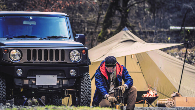 アピオは、オリジナルホイール・マフラー・サスペンションなどジムニー専用パーツを、ジムニーがまだ2サイクルだった時代から開発・販売しています。アピオパーツを装備したアピオジムニーコンプリートカーの展示は車中泊やソロキャンプシーンを提案。またジムニーと共に「日常を旅する毎日に」というテーマに沿って毎日使う「鞄」「財布」や日常の生活シーンも旅の記録としていつでも携帯できるミニスケッチブックなどもリリース。