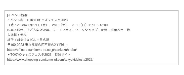 住友不動産商業マネジメント株式会社(本社:東京都新宿区 代表取締役社長:山本 直人)が、「新宿住友ビル 三角広場」(所在:東京都新宿区)において実施する、『TOKYOキッズフェスタ2023』についてお知らせいたします。