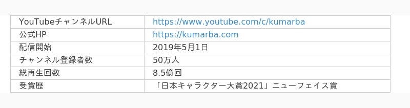 「クマーバチャンネル」は、お子様がキャラクターと一緒に楽しく成長できるエンタメ知育チャンネルです。「未就学児の想像力と表現力を豊かにし、可能性を広げる」ことをテーマにコンテンツを制作しています。YouTubeで良質なコンテンツを配信することで、いつでもどこでも楽しみながら心身ともに成長できることを目指しています。新しい未就学児向けコンテンツとして評価され、「日本キャラクター大賞2021」ニューフェイス賞を受賞しました。
