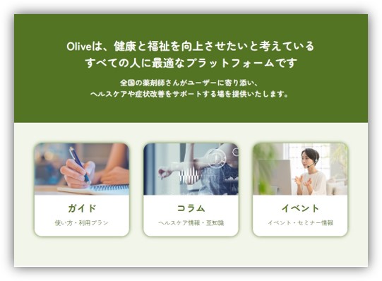 この度公開するサイトでは、Oliveのガイド(使い方)や薬剤師が執筆するコラム、イベント・セミナー情報などのコンテンツを公開します。気軽にヘルスケアや症状改善を相談できることを目的とした「薬剤師チャットOlive」は、自身のカラダや健康に向き合うきっかけ作りを提案するサービスですが、本サイトでは薬剤師とのチャットだけではなく、薬剤師をはじめとする有識者が執筆するコラムやイベント・セミナー情報を通じて、利用者の方が自身の健康と向き合うきっかけづくりを後押しします。