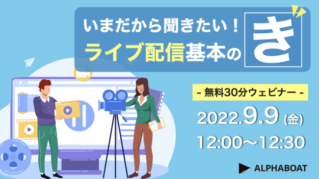 「ソーシャル領域のコミュニケーションのスペシャリスト」としてデジタルコンテンツの制作やライブ配信事業等を行うALPHABOAT合同会社(所在地:東京都渋谷区、社長:西谷 大蔵、以下「ALPHABOAT」)は、9月9日(金)12:00より「いまだから聞きたい!ライブ配信基本の"き"」セミナーを開催いたします。